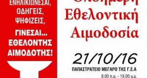 Ο Σύλλογος Εθελοντών Αιμοδοτών Αγρινίου σε συνεργασία με το Γενικό Νοσοκομείο Αγρινίου σας προσκαλεί στην Ολοήμερη Εθελοντική Αιμοδοσία, που θα πραγματοποιηθεί την Παρασκευή 21 Οκτωβρίου 2016...