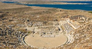 Ερειπωμένες κερκίδες, μισογκρεμισμένο σκηνικό οικοδόμημα, αυτοφυή βλάστηση, διάσπαρτα αρχιτεκτονικά μέλη με θέα το Αρχιπέλαγος. Η εικόνα του αρχαίου θεάτρου της Δήλου μετά την καταστροφή του,...