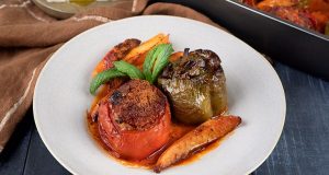 Συστατικά 5 ντομάτες 5 πιπεριές πράσινες 1 κρεμμύδι 1 σκ. σκόρδο 1 κ.σ. κοφτή ζάχαρη κρυσταλλική 1 ματσάκι δυόσμο 1/2 ματσάκι μαϊντανό αλάτι πιπέρι 200 γρ. ρύζι γλασέ 2 κ.σ. βούτυρο 1 κιλό πατάτες 2 κ.σ. πελτέ ντομάτας 250 γρ. νερό 5-6 κ.σ. ελαιόλαδο 100 γρ. φρυγανιά Για το σερβίρισμα ψωμί...