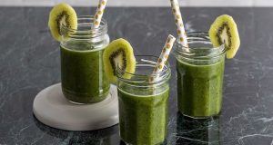 Συστατικά 4 ακτινίδια, + έξτρα φέτες, για το σερβίρισμα 1 μήλο πράσινο 20 γρ. τζίντζερ, φρέσκο 100 γρ. kale, χωρίς το κοτσάνι και το κεντρικό νεύρο 1/2 ματσάκι δυόσμο, φρέσκο, μόνο τα φύλλα 2 αγγούρια, μεγάλα, καθαρισμένα χυμό λεμονιού, από 1...