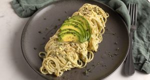 Συστατικά 500 γρ. σπαγγέτι 1 1/2 αβοκάντο αλάτι πιπέρι 3 κ.σ. ελαιόλαδο 1 πρέζα μπούκοβο ξύσμα λεμονιού, από 1 λεμόνι 250 γρ. τυρί κρέμα 1 κρεμμύδι 1 σκ. σκόρδο 1 πρέζα ζάχαρη κρυσταλλική 1 κ.σ. θυμάρι Για το σερβίρισμα αβοκάντο ελαιόλαδο πιπέρι θυμάρι...