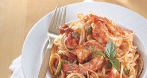 Υλικά 1 συσκευασία λιγκουίνι 24 γαρίδες μεγάλες 1 νεροπότηρο ντομάτα κονκασέ 1½ νεροπότηρο χυμό ντομάτας 10 ντομάτες λιαστές, ψιλοκομμένες 3 κουτ. σούπας κάππαρη ψιλή 3 κουτ. σούπας βασιλικό...