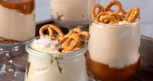 Συστατικά Για τη σάλτσα καραμέλας 500 γρ. κρέμα γάλακτος 35% 300 γρ. ζάχαρη κρυσταλλική 1 κ.γ. εκχύλισμα βανίλιας 1 πρέζα αλάτι Για τη μους 300 γρ. κρέμα γάλακτος 35%, παγωμένη Για το σερβίρισμα μπισκότα, τριμμένα μίνι πρέτζελ ανθό...