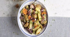 Συστατικά 1 κρεμμύδι 1 καρότο 200 γρ. πατάτες baby, βρασμένες 2 κ.σ. μαϊντανό χυμό λεμονιού, από 1 λεμόνι ξύσμα λεμονιού, από 1 λεμόνι 50 γρ. ελαιόλαδο...