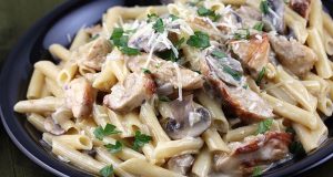 ΥΛΙΚΑ 500 γρ. κοντό ζυμαρικό (τύπου ριγγατόνι, πένες, φαρφάλες) 350 γρ. κοτόπουλο μπούτι, φιλέτο 100 γρ. ελαιόλαδο 250 γρ. μανιτάρια λευκά, σε τέταρτα 100 γρ. μπέικον...
