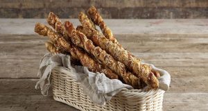 Συστατικά 50 γρ. βούτυρο, λιωμένο 850 γρ. φύλλα σφολιάτας 200 γρ. γραβιέρα, τριμμένη 1 κρόκο, αραιωμένο σε 1 κ.σ. νερό Για τη σύνθεση 50 γρ. σουσάμι...