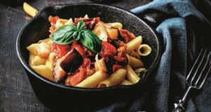 Υλικά για 4 άτομα 500 γρ. πένες 2 μέτριες μελιτζάνες 1 φλιτζάνι τριμμένη φρέσκια ντομάτα 1 φλιτζάνι ντοματίνια κομμένα στη μέση 3 κουταλιές ελαιόλαδο 2 σκελίδες...