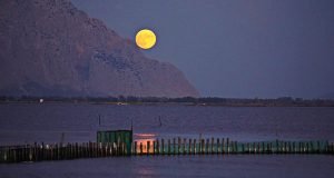 Ανάρτηση της Βάνας Σαρακινού Μαγευτικές εικόνες από τη Λιμνοθάλασσα Μεσολογγίου, με την πανσέληνο να καθρεφτίζεται στα νερά της.