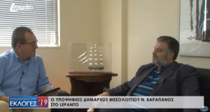 Στον τηλεοπτικό σταθμό LEPANTO RTV παραχώρησε σήμερα συνέντευξη ο υπ. Δήμαρχος Ιεράς Πόλεως Μεσολογγίου Νικόλαος Καραπάνος. Ο Ν. Καραπάνος μιλώντας για την θητεία της δημοτικής αρχής...