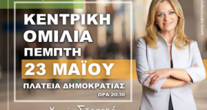 Την κεντρική της ομιλία θα πραγματοποιήσει η υποψήφια Δήμαρχος Αγρινίου και Επικεφαλής του Συνδυασμού «Αγρίνιο Μπορείς» Χριστίνα Σταρακά, την Πέμπτη 23 Μαΐου, στις 20.30 μ.μ. στη...