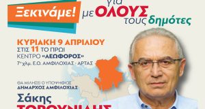 Υποψήφιος δήμαρχος Αμφιλοχίας ο Σάκης Τορουνίδης Υποψήφιος δήμαρχος Αμφιλοχίας ο Σάκης Τορουνίδης – Επίσημη ανακοίνωση την Κυριακή 9 Απριλίου σε μεγάλη συγκέντρωση Με στόχο έναν δήμο...