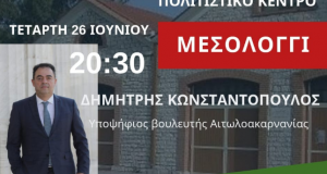 Με ανακοίνωσή του ο υποψήφιος Βουλευτής Αιτωλοακαρνανίας με το Κίνημα Αλλαγής, Δημήτρης Κωνσταντόπουλος κάνει γνωστό πως θα πραγματοποιήσει ομιλία μου στο Μεσολόγγι, την Τετάρτη 26 Ιουνίου και ώρα 20:30,...