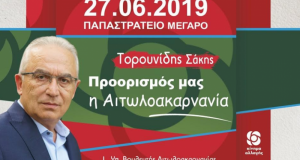 Με σύνθημα «Προορισμός μας η Αιτωλοακαρνανία» ο Σάκης Τορουνίδης, υποψήφιος βουλευτής Αιτωλοακαρνανίας με το ΚΙΝ.ΑΛ. –ΠΑ.ΣΟ.Κ., πραγματοποιεί την Πέμπτη 27 Ιουνίου την κεντρική πολιτική του ομιλία...