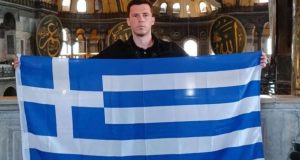 Αντιδράσεις προκάλεσε στην Τουρκία η κίνηση του Έλληνα τουρίστα Απόστολου Παπαθεοδώρου να φωτογραφηθεί μέσα στην Αγία Σοφία κρατώντας στα χέρια του την ελληνική σημαία. Στη λεζάντα...