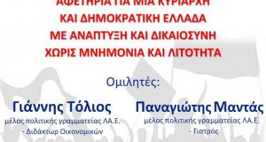 Τετάρτη 24/5/2017 ώρα 8.00μ.μ. στο Εργατικό κέντρο Μεσολογγίου ΕΘΝΙΚΟ ΝΟΜΙΣΜΑ ΑΦΕΤΗΡΙΑ ΓΙΑ ΜΙΑ ΚΥΡΙΑΡΧΗ ΚΑΙ ΔΗΜΟΚΡΑΤΙΚΗ ΕΛΛΑΔΑ ΜΕ ΑΝΑΠΤΥΞΗ ΚΑΙ ΔΙΚΑΙΟΣΥΝΗ ΧΩΡΙΣ ΜΝΗΜΟΝΙΑ ΚΑΙ ΛΙΤΟΤΗΤΑ Ομιλητές:...