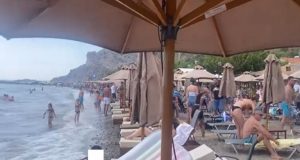 Οι ριπές του ανέμου ήταν πολύ δυνατές με αποτέλεσμα οι άνθρωποι των καταστημάτων να τρέξουν να κλείσουν τις ομπρέλες, ωστόσο αρκετά φουσκωτά τα πήρε ο αέρας....