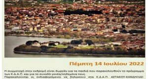 Την Πέμπτη 14 Ιουλίου 2022, θα πραγματοποιηθεί η εκδρομή των Κ.Δ.Α.Π. Ξηρομέρου στα Ιωάννινα. Η συμμετοχή στην εκδρομή είναι δωρεάν για τα παιδιά που παρακολουθούν το...