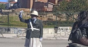 Τροχονόμος τσολιάς ρυθμίζει τη κυκλοφορία στην πλατεία Αγίου Γεωργίου στην Πάτρα ανήμερα Τσικνοπέμπτη. Πρόκειται για μέλος του περίφημου πληρώματος του καρναβαλιού «Άσπρο -Μαύρο» που έκανε πράξη...