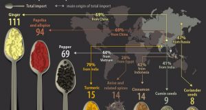 Τα κράτη μέλη της Ε.Ε. εισήγαγαν 379.000 τόνους μπαχαρικών από χώρες εκτός Ε.Ε. το 2019. Το τζίντζερ αντιπροσώπευε το μεγαλύτερο μερίδιο αυτών των εισαγωγών (111.000 τόνοι),...