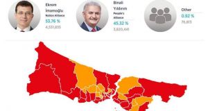 Ο Εκρέμ Ιμάμογλου νίκησε τις εκλογές στην Κωνσταντινούπολη, συγκεντρώνοντας ποσοστό μεγαλύτερο του 54%, έναντι λίγο πάνω από το 45% που συγκέντρωσε ο εκλεκτός του Σουλτάνου, Μπιναλί...
