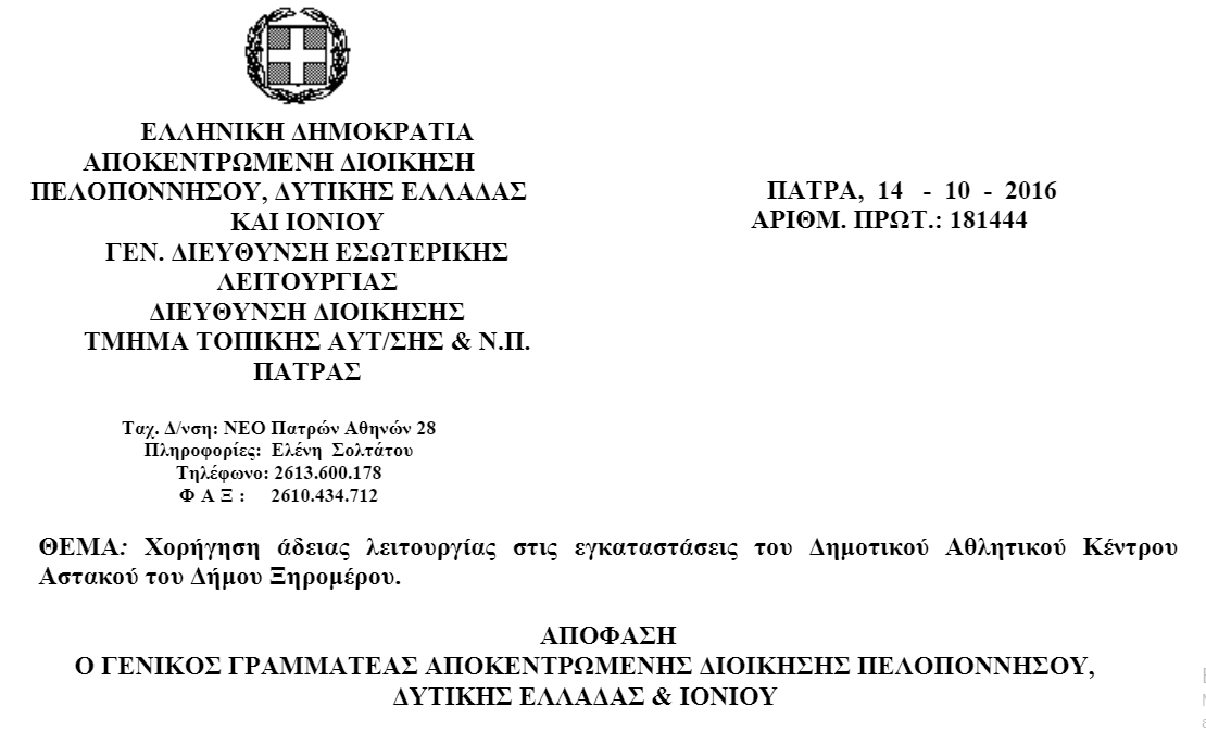 Εξασφαλίστηκε από την Αποκεντρωμένη Διοίκηση Πελοποννήσου, Δυτικής Ελλάδας και Ιονίου, η άδεια λειτουργίας διάρκειας 2 χρόνων για το νέο δημοτικό κλειστό γήπεδο του Αστακού.