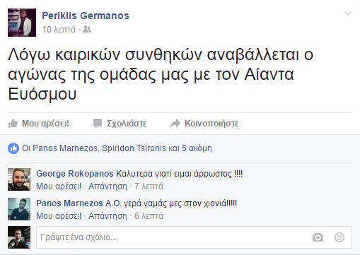 Οι άσχημες καιρικές συνθήκες που επικρατούν στη περιοχή του Αγρινίου έγιναν αφορμή για την αυριανή αναβολή του αγώνα Μπάσκετ, μεταξύ του Α.Ο. Αγρινίου και της ομάδας του Αίαντα Ευόσμου, όπως ανακοίνωσε πριν από λίγο ο πρόεδρος της ομάδας, Περικλής Γερμανός.