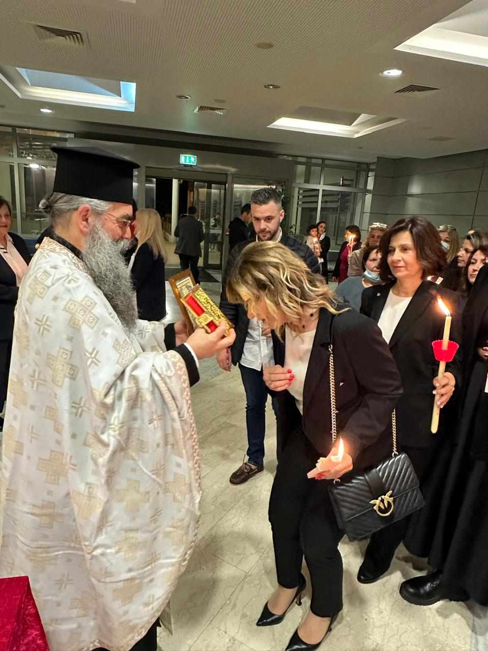 Είχε προηγηθεί η επίσκεψή της σε ηλικιωμένους που φιλοξενούνται στο Γηροκομείο Χριστιανικής Ένωσης Αγρινίου, εκεί όπου αντάλλαξε θερμές ευχές για καλή Ανάσταση και καλό Πάσχα με τους τρόφιμους και το προσωπικό, μοιράζοντας πασχαλινά τσουρέκια.