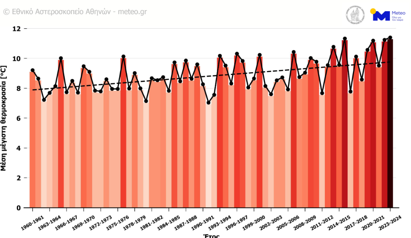 Στην Εικόνα 1 παρουσιάζεται η μέση μέγιστη θερμοκρασία για την περίοδο του χειμώνα από το 1960 μέχρι το 2024 στο σύνολο της Ελλάδας. Ο χειμώνας του 2023-2024 καταγράφεται ως ο θερμότερος στα χρονικά για την Ελλάδα, ξεπερνώντας τον χειμώνα του 2015-2016. Πολύ σημαντικό γεγονός είναι πως τα τελευταία 10 χρόνια έχουν καταγραφεί οι 6 θερμότεροι χειμώνες όλων των εποχών. Η μέση μέγιστη θερμοκρασία στην Ελλάδα από το 1960 μέχρι και το 2024 για την περίοδο του χειμώνα παρουσιάζει άνοδο κατά 1.8 °C.
