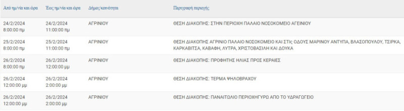 Προκειμένου να εκτελεστούν απαραίτητες τεχνικές εργασίες του Δ.Ε.Δ.Δ.Η.Ε. στα δίκτυα διανομής ηλεκτρικής ενέργειας το Σαββατοκύριακο 24 και 25 Φεβρουαρίου 2024 και τη Δευτέρα, 26 Φεβρουαρίου 2024 θα πραγματοποιηθούν προγραμματισμένες διακοπές ρεύματος σε διάφορες περιοχές του Αγρινίου.