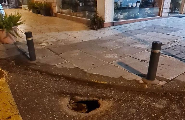 «Λόγω υποχώρησης του υπεδάφους στην συμβολή των οδών Μακρή – Χ. Τρικούπη, μπροστά στο ανθοπωλείο « Πιστιόλη» έχει ανοίξει οπή.