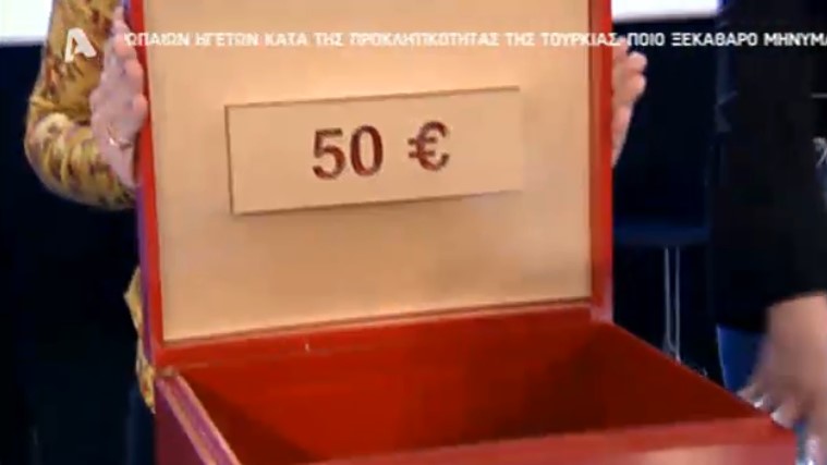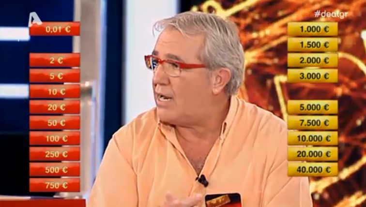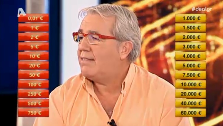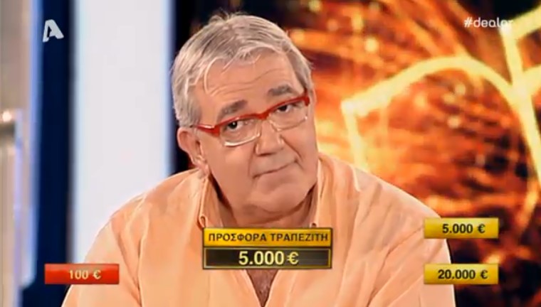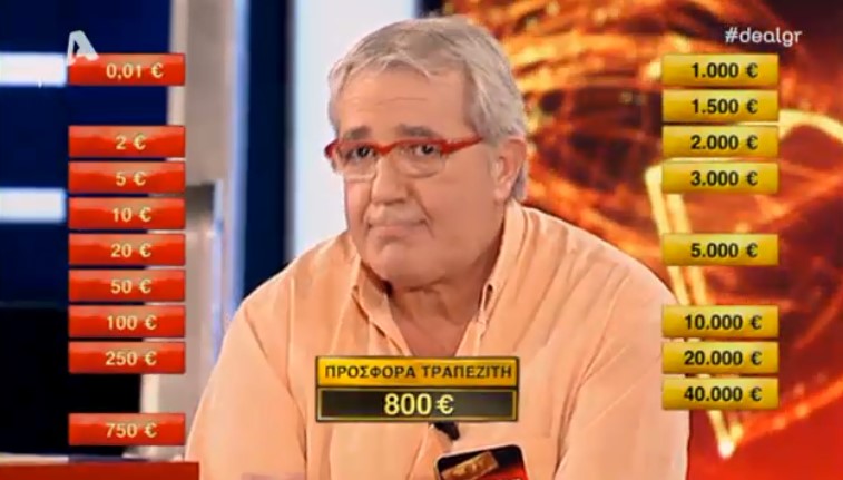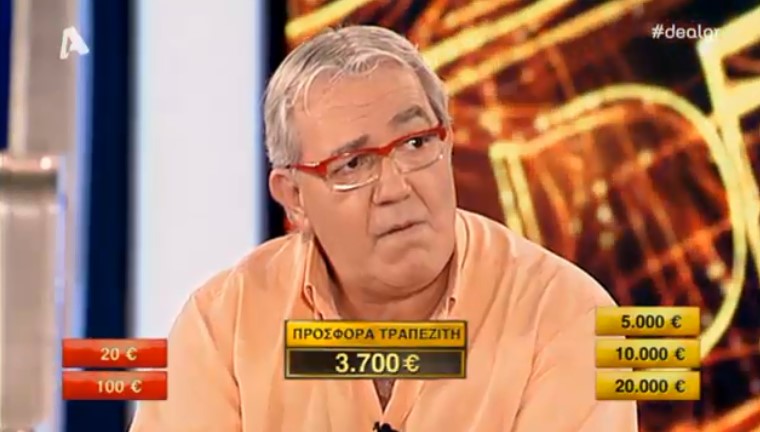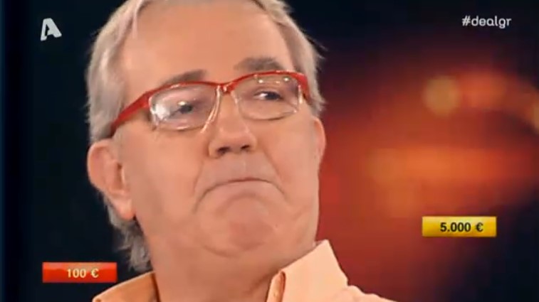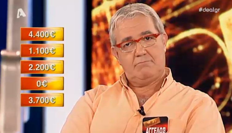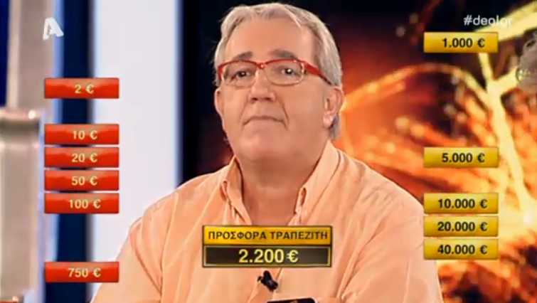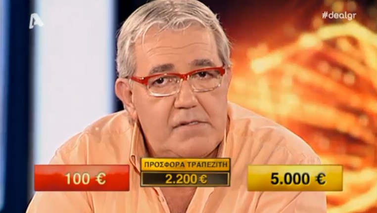 Σε προηγούμενα επεισόδια τον είχαμε δει να έχει πολλές φορές ένα μεγάλο ποσό, αλλά σήμερα δεν στάθηκε και τόσο τυχερός, έχοντας στο αρχικό του κουτί το ποσό των 50 ευρώ το οποίο αντάλλαξε παίρνοντας κάτι πολύ μεγαλύτερο, όμως, περιορίστηκε στην τελευταία προσφορά του τραπεζίτη που ήταν 2.200 ευρώ.