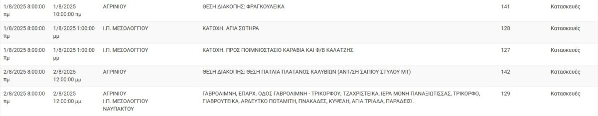Δ.Ε.Δ.Δ.Η.Ε.: Οι προγραμματισμένες διακοπές για 1 και 2 Αυγούστου σε Αγρίνιο, Μεσολόγγι και Ναύπακτο