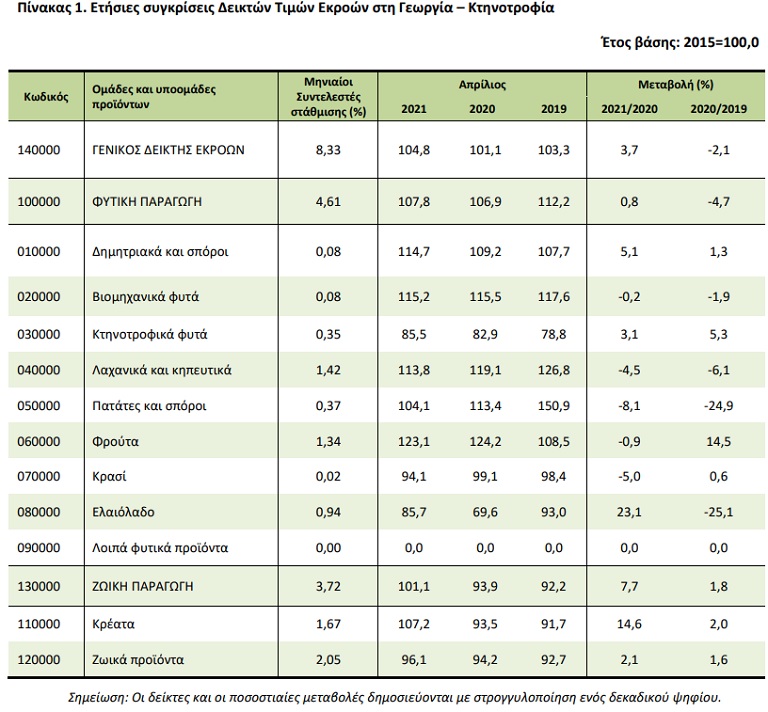 Η αύξηση του Γενικού Δείκτη Τιμών Εκροών κατά 3,7%, τον μήνα Απρίλιο 2021, σε σύγκριση με τον αντίστοιχο δείκτη του Απριλίου 2020, οφείλεται στην αύξηση κατά 7,7% του δείκτη τιμών της ζωικής παραγωγής και κυρίως στη μεταβολή της ομάδας κρέατα.