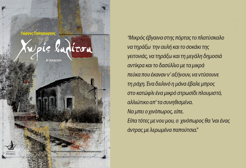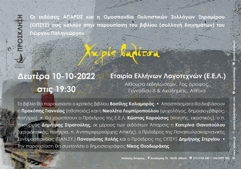 Οι εκδόσεις «Άπαρσις» και η Ομοσπονδία Πολιτιστικών Συλλόγων Ξηρομέρου (Ο.Π.ΣΥ.Ξ.) σας καλούν στην παρουσίαση του βιβλίου (συλλογή διηγημάτων) «Χωρίς Βαλίτσα» του Γιώργου Παληγεώργου, στην αίθουσα εκδηλώσεων της Εταιρίας Ελλήνων Λογοτεχνών (Ε.Ε.Λ.) Γενναδίου 8 & Ακαδημίας, 7ος όροφος, στην Αθήνα. Δευτέρα, 10 Οκτωβρίου 2022, ώρα 19:30.