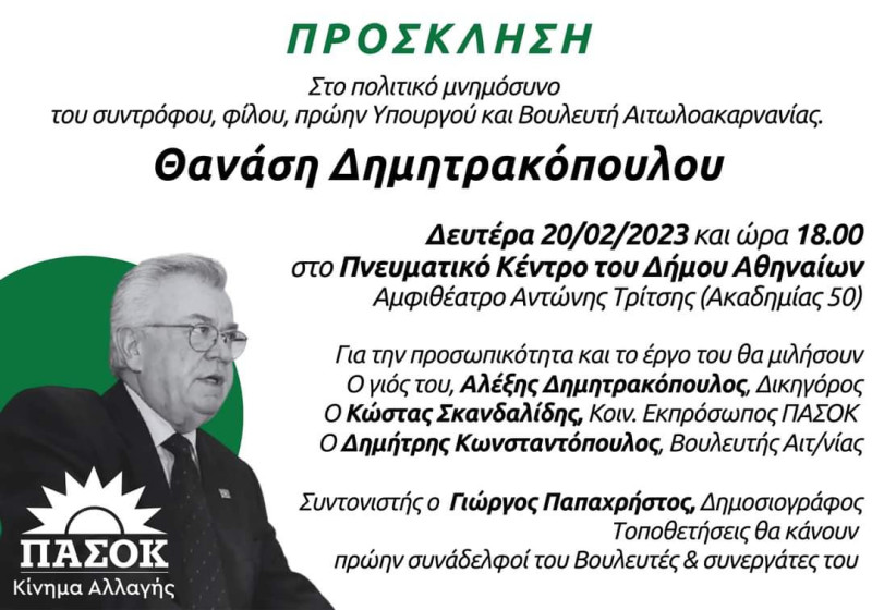 Την ερχόμενη Δευτέρα, 20 Φεβρουαρίου 2023 και ώρα 18:00 θα τελεστεί το πολιτικό μνημόσυνο του συντρόφου, φίλου, πρώην Υπουργού και Βουλευτή Αιτωλοακαρνανίας Θανάση Δημητρακόπουλου στο Πνευματικό Κέντρο του Δήμου Αθηναίων Αμφιθέατρο «Αντώνης Τρίτσης» (Ακαδημίας 50).