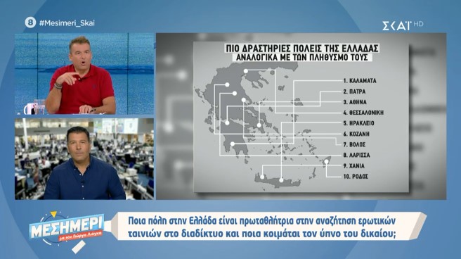 Ιδιαίτερη σχέση με το διαδίκτυο και συγκεκριμένα με την αναζήτηση και θέαση ερωτικών ταινιών φαίνεται πως έχει η Καλαμάτα. Αυτό τουλάχιστον προκύπτει από έρευνα της εταιρίας παραγωγής ταινιών πορνό “Sirina”. Μετά τη μεσσηνιακή πρωτεύουσα που κρατά τα πρωτεία, πιο «δραστήριες» πόλεις στην Ελλάδα (αναλογικά με τον πληθυσμό τους) στη θέαση πορνό αναδείχθηκαν στη δεύτερη θέση η Πάτρα και στην τρίτη η Αθήνα. Την τελευταία θέση της λίστας έχει η Ρόδος.