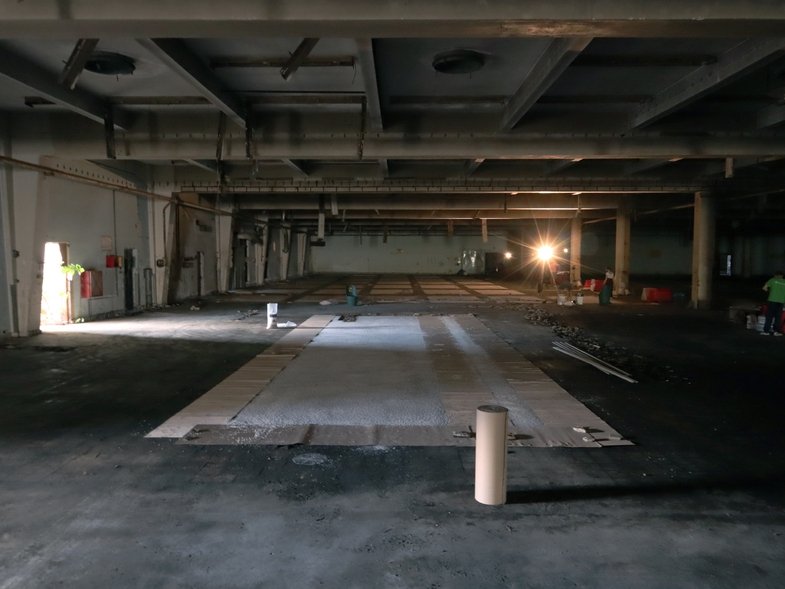 Τα «ίχνη» των μηχανημάτων εμφανίζονται σχεδιασμένα στο δάπεδο σαν κάτοψη που απεικονίζει τη διάταξη που είχαν οι μηχανές στον χώρο του εργοστασίου όταν αυτό λειτουργούσε. Το αλάτι, ένα υλικό που κατά τη λειτουργία του εργοστασίου χρησιμοποιούνταν στη διαδικασία παραγωγής, αλλά και αυτό που έχει αρχίσει να εισβάλλει στο χώρο λόγω της μακροχρόνιας έλλειψης χρήσης, επιλέχθηκε για να επισημάνει με τρόπο σαφή αλλά και εύθραυστο τις θέσεις των μηχανών.