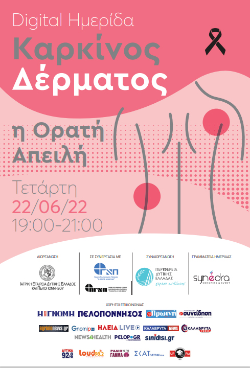 Η Ιατρική Εταιρία Δυτικής Ελλάδος και Πελοποννήσου (Ι.Ε.Δ.Ε.Π.), σε συνεργασία με την Ογκολογική Μονάδα του Γενικού Νοσοκομείου Πατρών «Άγιος Ανδρέας», τη Δερματολογική Κλινική του Πανεπιστημιακού Γενικού Νοσοκομείου Πατρών «Παναγία η Βοήθεια» και σε συνδιοργάνωση με την Περιφέρεια Δυτικής Ελλάδας, πραγματοποιεί διαδικτυακή επιστημονική ημερίδα με «Καρκίνος Δέρματος η Ορατή Απειλή» την Τετάρτη 22 Ιουνίου 2022 και ώρα 19:00.