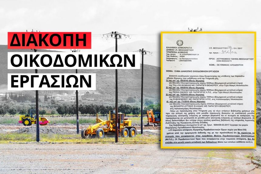 Η υπηρεσία Δόμησης του Δήμου Ιερής Πόλης Μεσολογγίου εξέδωσε σήμα διακοπής των οικοδομικών εργασιών των μονάδων ηλεκτροπαραγωγής από βιορευστά στο Ευηνοχώρι. Ως αιτιολογία για την διακοπή παρουσιάζεται η διερεύνηση των αδειών δόμησης που είχαν δοθεί.