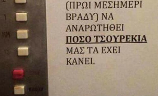 Η ανακοίνωση σε ασανσέρ πολυκατοικίας στη Χαλκιδική προκαλεί άφθονο γέλιο. Κατά καιρούς έχουν εμφανιστεί στο διαδίκτυο διάφορες φωτογραφίες από σημειώματα που μπήκαν σε πολυκατοικίες για συμμόρφωση κάποιου ενοίκου. Κάθε φορά η αφορμή είναι διαφορετική, όμως το αποτέλεσμα παραμένει πάντα ξεκαρδιστικό.