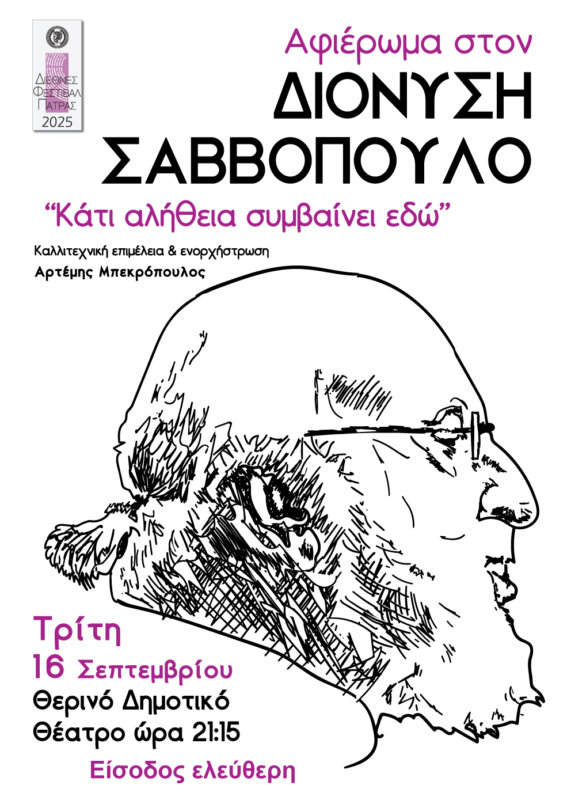 Η Αντιδημαρχία Πολιτισμού του Δήμου Πατρέων, στο πλαίσιο του Διεθνούς Φεστιβάλ Πάτρας, διοργανώνει συναυλία, αφιερωμένη στον Διονύση Σαββόπουλο.