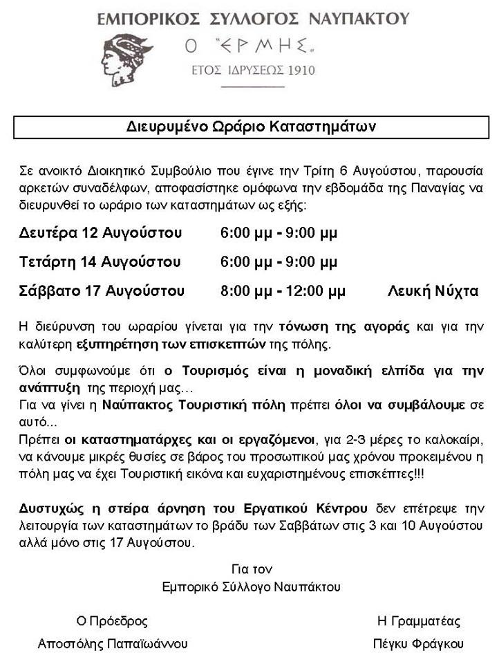 Με διευρυμένο ωράριο για δύο ημέρες τη Δευτέρα 12 και Τετάρτη 14 Αυγούστου και μία «λευκή νύχτα» κατόπιν εορτής, στις 17 Αυγούστου η αγορά της Ναυπάκτου προσπαθεί μέσα από τη στείρα άρνηση του Εργατικού κέντρου, όπως επισημαίνει ο Εμπορικός Σύλλογος Ναυπάκτου να δείξει το τουριστικό της πρόσωπο, ευελπιστώντας σε μια άνοδο του τζίρου της, εν όψει μάλιστα του δύσκολου χειμώνα που είναι μπροστά μας.