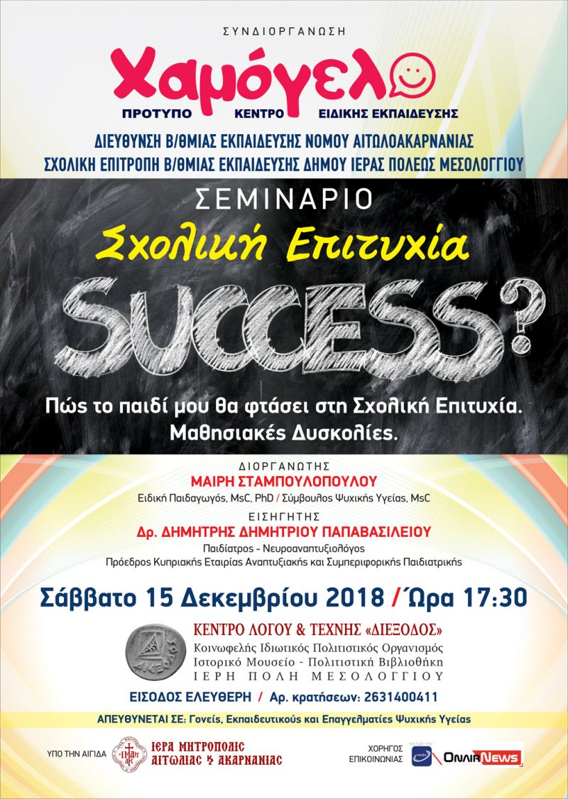 Η «Διέξοδος» με χαρά θα φιλοξενήσει το απόγευμα του Σαββάτου 15 Δεκεμβρίου 2018, στις 5.30 μ.μ. στους χώρους του Ιστορικού της Μουσείου σεμινάριο με τον τίτλο «Σχολική επιτυχία SUCCESS – Πώς το παιδί μου θα φθάσει στη σχολική επιτυχία – Μαθησιακές δυσκολίες».