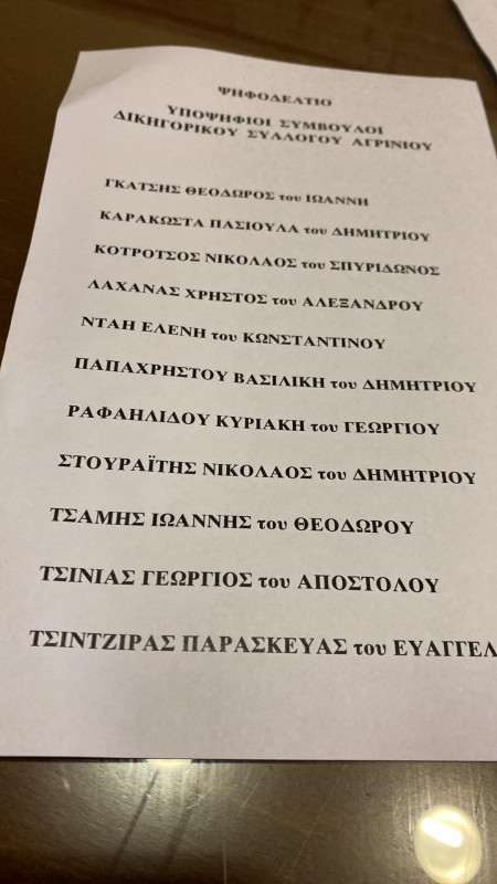 Εγγεγραμμένα είναι 202 μέλη και ο αριθμός των υποψήφιων Συμβούλων του Δικηγορικού Συλλόγου Αγρινίου είναι έντεκα εκ των οποίων θα εκλεγούν οκτώ και μαζί με τον Πρόεδρο θα είναι συνολικά εννέα: