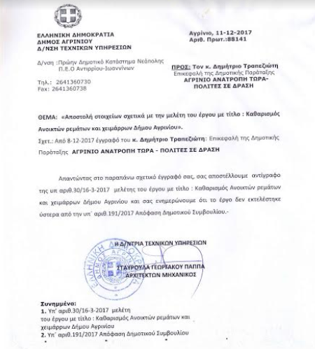 Μετά τις πρόσφατες πλημμύρες και τις καταστροφικές συνέπειες που είχαν για τους συνδημότες μας και τις περιοχές που επλήγησαν, ο επικεφαλής της παράταξής μας, Δημήτρης Τραπεζιώτης, υπέβαλε αίτηση στο Δήμο Αγρινίου προκειμένου να πληροφορηθεί εάν το ανωτέρω έργο εκτελέστηκε μερικώς ή ολικώς και έλαβε από τη Διεύθυνση Τεχνικών Υπηρεσιών του Δήμου Αγρινίου το με αριθ. πρωτ. 88141/11-12-2017 έγγραφο – απάντηση «ΒΟΜΒΑ» ότι το έργο αυτό ΟΥΔΕΠΟΤΕ ΕΚΤΕΛΕΣΤΗΚΕ και την οποία απάντηση σήμερα δημοσιεύουμε.