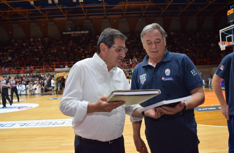 Ο Δήμαρχος έδωσε συγχαρητήρια και χάρισε τα βιβλία «Χαρτών Μνήμες» και «Εικαστικές Τέχνες και Αντίσταση» καθώς κι από ένα τοπικό προϊόν στους παίκτες, στον προπονητή Κώστα Μίσσα και στους άλλους τεχνικούς της ομάδας, ευχόμενος να συνεχίσουν την νικηφόρα πορεία τους και στο Ευρωμπάσκετ του 2017.