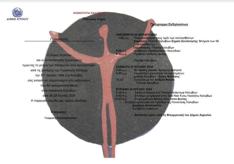 Ο Δήμος Αγρινίου και οι Αντιστασιακές Οργανώσεις τιμώντας τη μνήμη των πατριωτών που εκτελέστηκαν από τις Δυνάμεις της Γερμανικής Κατοχής την 31η Ιουλίου 1944 στα Καλύβια, σας καλούν να συμμετάσχετε στις εκδηλώσεις που θα πραγματοποιηθούν στην Κοινότητα Καλυβίων από 26-28 Ιουλίου 2024.