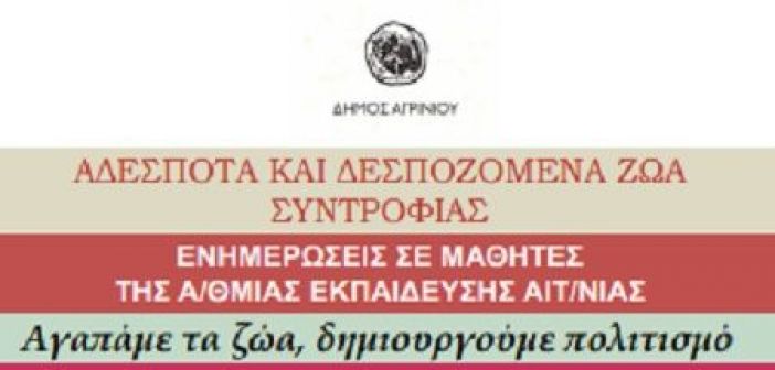 Στο πλαίσιο του προγράμματος και μετά από την έγκριση υλοποίησής του από το Υπουργείο Παιδείας, Έρευνας και Θρησκευμάτων [Φ14/ΜΚ/216812/225296/Δ1-28/12/2017 ‘Έγκριση υλοποίησης προγράμματος/ δράσεων με τίτλο: «Αγαπάμε τα ζώα δημιουργούμε πολιτισμό» για τις σχολικές μονάδες της Α/θμιας Εκπ/σης Αιτ/νιας’] σε συνεργασία με τη Δ/νση Πρωτοβάθμιας Εκπαίδευσης Αιτ/νιας ο Δήμος Αγρινίου διοργανώνει για το σχολικό έτος 2017-2018: