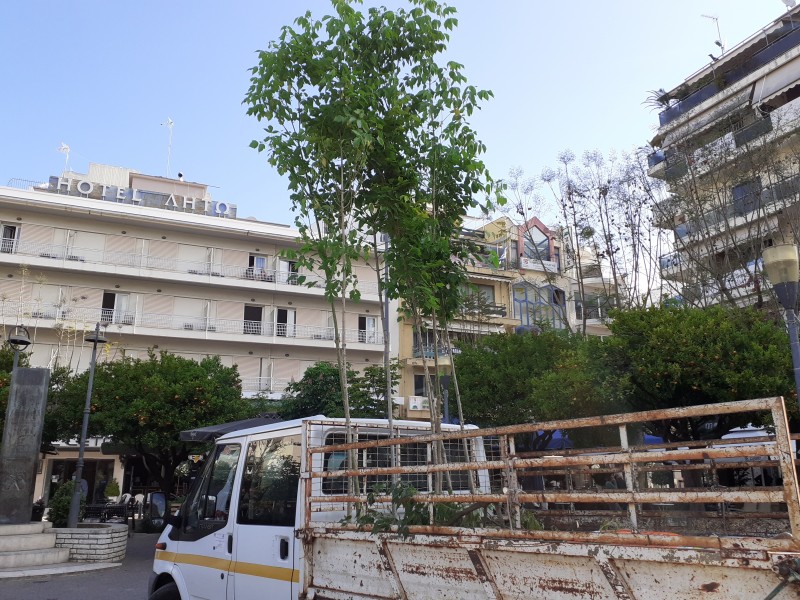 Το πρωί, συνεργεία της Διεύθυνσης Περιβάλλοντος και Πρασίνου, αντικατέστησαν τα δένδρα που είχαν καταστραφεί στην πλατεία Δημοκρατίας.