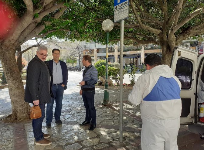 Συνεργεία πραγματοποιούν, κατά τις μεσημεριανές και απογευματινές ώρες, απολυμάνσεις στην Πλατεία Δημοκρατίας, Παναγοπούλου, Δημάδη, Χατζοπούλου και Ειρήνης.
